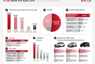 [오토모닝 정영창 기자] 2026년 신차에 대한 소비자 인식을 조사한 결과, 가격 상승과 금리 부담으로 실제 구매를 망설이는 소비자가 절반에 육박하는 것으로 나타났다. 국내 최대 직영중고차 플랫폼 기업 케이카(K Car)가 엠브레인을 통해 전국 성인 남녀 500명을 대상으로 2026년 출시 예정 신차 선호도와 자동차 구매 인식을 조사한 결과를 15일 공개했다. 신차 구매에 대한 인식을 물었을 때 ‘여전히 신차 구매를 선호한다’는 응답은 35.0%였지만, ‘가격 부담이 커 구매를 망설이고 있다’는 응답이 26.4%, ‘신차 대신 중고차를 적극 고려하고 있다’는 응답은 23.4%로 집계됐다. 두 응답을 합하면 전체의 49.8%에 달해, 소비자 절반가량이 신차 가격과 금리 환경을 이유로 구매를 주저하고 있는 것으로 나타났다. 유종 선호에서는 하이브리드가 52.6%로 가장 높았다. 내연기관은 31.4%, 전기차는 16.0%로 나타났다. 친환경차 전환에 대한 인식 항목에서도 하이브리드를 거치는 단계적 전환이 필요하다는 응답이 47.4%로 가장 높았고, 전기차 중심의 본격 전환이 필요하다는 응답은 17.2%를 기록했다. 충전 인프라와 보조금, 가격 안정성 등의 문제로