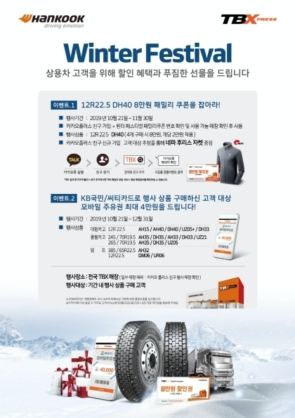 [오토모닝 정영창 기자] 한국타이어앤테크놀로지㈜(이하 한국타이어)가 이달 30일까지 트럭·버스용 타이어 구매 고객에게 할인 혜택과 사은품을 증정하는 'TBX 윈터 페스티벌' 이벤트를 진행한다고 12일 밝혔다. 한국타이어의 트럭∙버스 전문매장 TBX(Truck Bus Express)에서 진행되는 이번 이벤트는 사계절 내내 주행이 많은 트럭 및 버스 운전자들의 보다 안전하고 따뜻한 겨울철 주행을 위해 마련됐다.