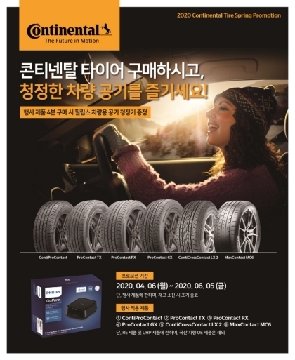 콘티넨탈은 이번 프로모션 행사 기간 중 뛰어난 성능의 콘티넨탈 타이어 제품 6종을 대상으로 1세트(4본)를 구매하는 고객에게 미세먼지 및 봄철 황사에 대비할 수 있는 ‘필립스 차량용 공기 청정기’를 재고 소진 시까지 증정한다.