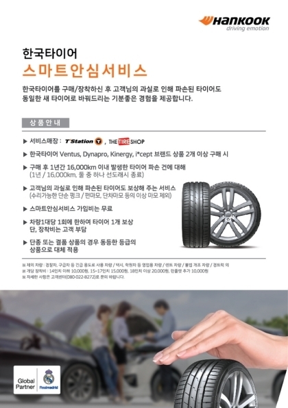 [오토모닝 정영창 기자] 한국타이어앤테크놀로지(이하 한국타이어)의 타이어 중심 자동차 토탈 서비스 전문점 티스테이션(T’Station)이 '스마트 안심 서비스'의 적용 상품군 및 대상 차량을 확대했다고 8일 밝혔다. 한국타이어 '스마트 안심 서비스'는 고객이 타이어를 구매·장착한 이후 1년 또는 1만6000km 이내 주행 중 파손된 타이어를 동일한 제품의 새 타이어로 무상 교체해주는 서비스로 고객 과실로 인해 파손된 타이어도 보상 대상에 포함된다.