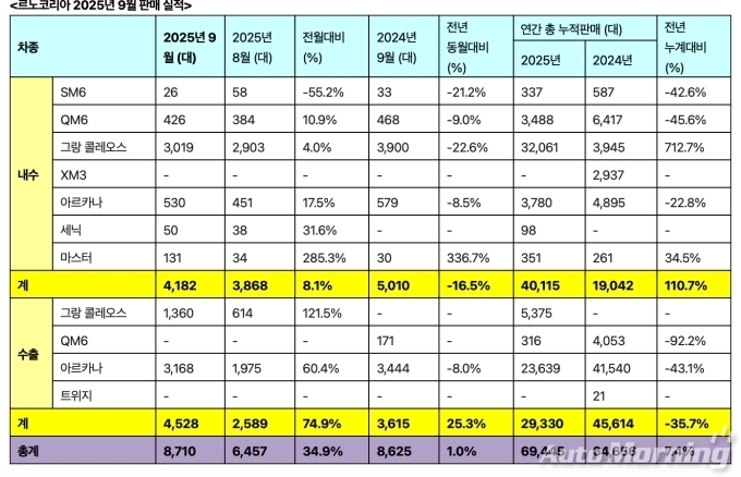 [오토모닝 정영창 기자] 르노코리아가 2025년 9월 한 달 동안 내수 4182대, 수출 4528대로 총 8710대의 판매 실적을 거두었다.