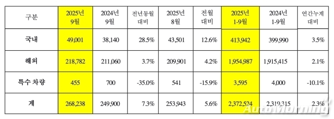 기아 관계자는 “국내의 경우 전년 추석 연휴로 인한 기저효과로 9월 판매가 늘었고 SUV 하이브리드 모델 및 EV3, EV4 등 글로벌 친환경차 판매 호조가 이어지며 역대 3분기 최대 판매를 기록했다“며 “앞으로 EV4 및 EV5, PV5 등 전기차 라인업을 앞세워 판매 성장세를 이어 나갈 것”이라고 밝혔다.