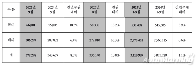 [오토모닝 정영창 기자] 현대자동차가 2025년 9월 국내 6만6001대, 해외 30만6297대 등 전 세계 시장에서 전년 동월 대비 8.3% 증가한 총 37만2298대를 판매했다. 지난해 같은 기간과 비교해 국내 판매는 18.3% 증가, 해외 판매는 6.4% 증가한 것으로 집계됐다.
