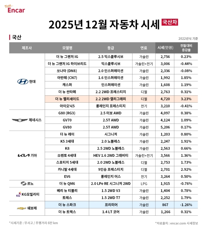 현대 캐스퍼 인스퍼레이션은 1.19%, 기아 더 뉴 레이 시그니처는 0.80%, KG모빌리티 베리 뉴 티볼리 1.5 2WD V3는 0.78% 시세가 상승했다. 한편, 쉐보레 더 뉴 스파크 프리미어는 시세가 1.26% 하락하며 12월 주요 국산차 중 가장 큰 하락세를 기록했다.