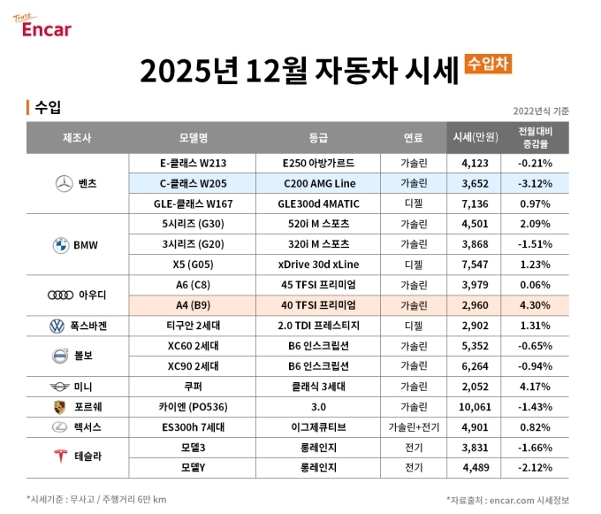 이 외에도 벤츠 E-클래스 W213 E250 아방가르드는 0.21%, 볼보 XC60 2세대 B6 인스크립션과 XC90 2세대 B6 인스크립션은 각각 0.65%, 0.94% 시세가 하락했다.