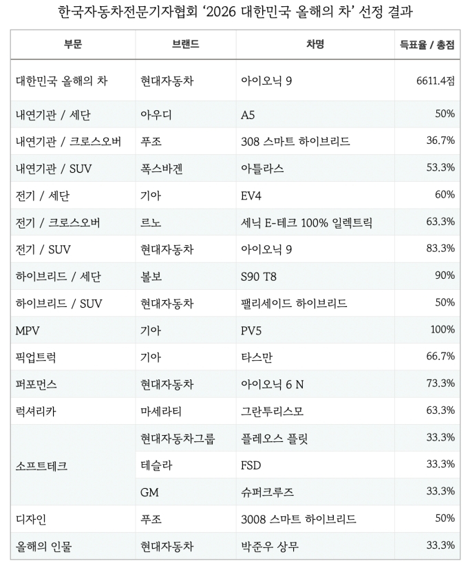 ‘2026 대한민국 올해의 차’는 전기차 간 경쟁이 치열하게 벌어졌다. 최종 평가에서는 현대자동차 아이오닉 9이 총점 6479.15점을 기록한 현대자동차 아이오닉 6 N과 총점 6477.7점을 기록한 기아 PV5를 제치고 종합 점수 6611.4점으로 1위에 올랐다.