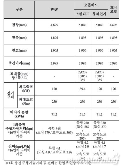 도너모델은 컨버전 전용 모델로, 컨버전 업체가 특장/인증 완료 후 소비자에게 직접 판매하는 미완성자동차를 말한다. PV5 WAV는 고객에게 보다 나은 이동의 자유를 제공하고자 하는 기아의 의지가 반영된 차량으로 휠체어 이용 승객의 편리하고 안전한 이동을 위해 국내 전기차 최초로 측면 출입 방식이 적용됐다.