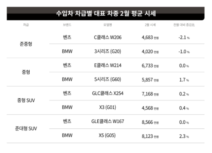 수입차 시장에서는 테슬라 하락세가 돋보였다. 테슬라가 모델 Y 주니퍼 신차 가격을 약 300만원, 모델 3 가격을 약 1000만원 인하하면서 중고차 시세에도 큰 영향을 준 것으로 보인다. 이 여파로 모델 Y와 모델 Y 주니퍼는 각각 5.3%, 5.6% 하락했고, 모델 3 역시 3.9% 하락할 것으로 보인다.