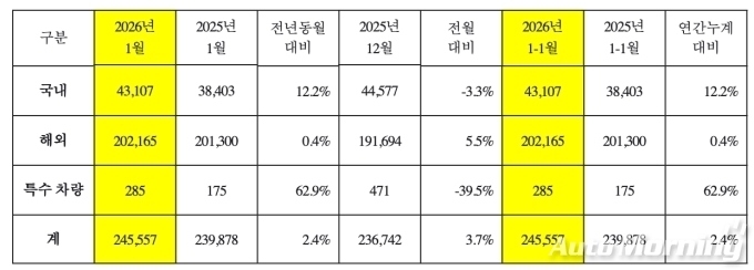 [오토모닝 정영창 기자] 기아는 1월 글로벌 시장에서 국내 4만3107대, 해외 20만2165대, 특수 285대 등 전년 동기 대비 2.4% 증가한 24만5557대를 판매했다고 2일 밝혔다.
