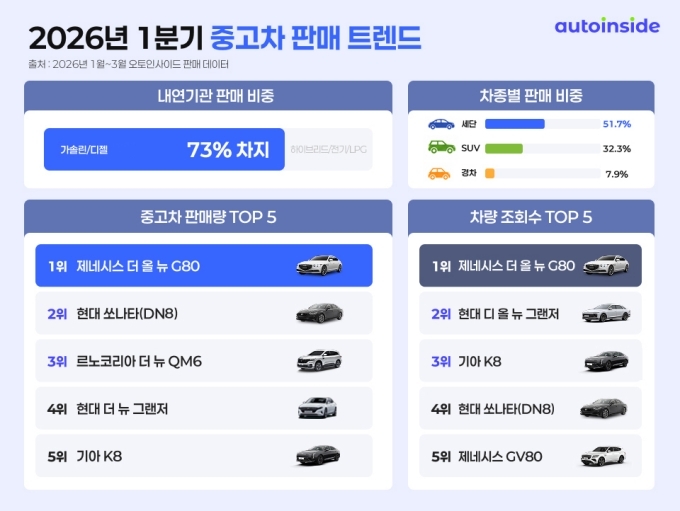 오토인사이드 관계자는 “올해 1분기 중고차 시장에서는 제네시스 G80을 비롯한 준대형 이상 세단의 관심과 판매가 이어지는 가운데, 경기 둔화와 고유가 기조 속에서 경차 및 친환경차 중심의 실속형 수요도 함께 확대되는 흐름이 나타났다”며 “소비자들은 신차 대비 가격 메리트가 있는 중고 프리미엄 모델을 선택하는 한편, 차량 가격과 연료 효율, 유지 관리 비용 등을 종합적으로 고려하며 구매 기준을 보다 다각화하고 있는 것으로 보인다”고 말했다.