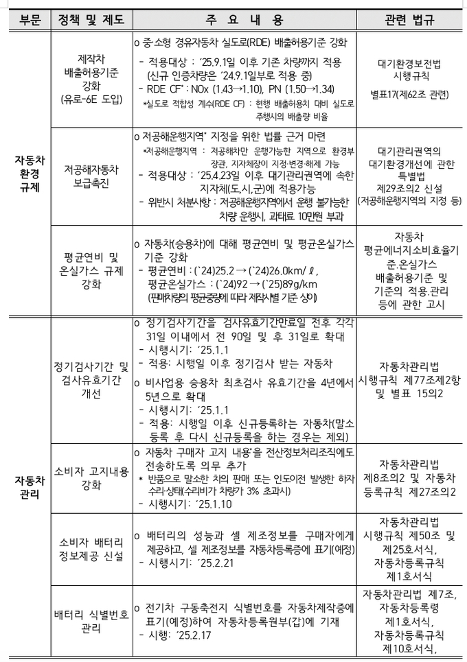 자동차 환경규제 부문에서는 경유차 실도로 배출허용기준과 승용차 평균연비·온실가스 기준이 강화되는 한편, 저공해차만 운행가능한 ‘저공해운행지역’ 지정을 위한 법률근거가 마련되어 지자체 조례로써 저공해운행지역 지정이 가능해질 예정이다.