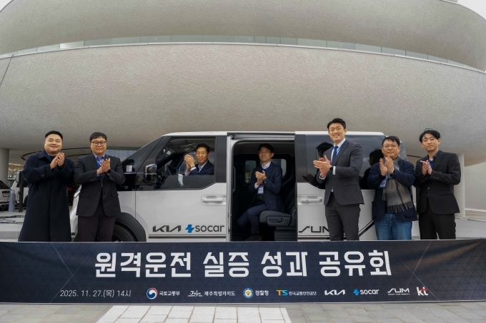 기아는 27일 제주도에서 기아, 쏘카, 자율주행 스타트업 에스유엠(SUM), KT와 국토교통부, 제주특별자치도, 경찰청, 한국교통안전공단 등 주요 관계자들이 참석한 가운데 ‘원격 운전 실증 성과 공유회’를 열고 원격 운전 기술 개발 현황 등을 공개했다.