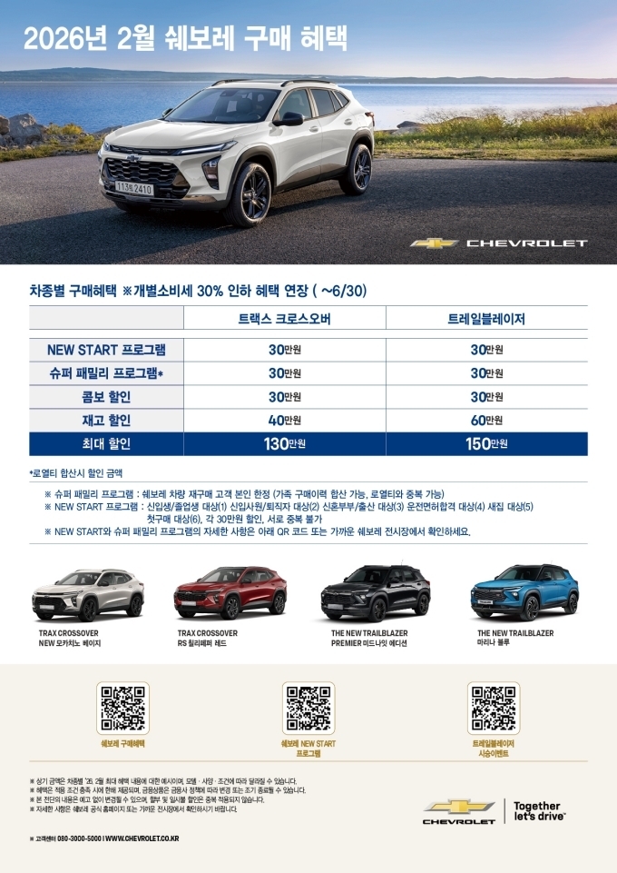 쉐보레는 첫 차 구매를 준비하는 고객과 새학기·취업·결혼·이사 등 새로운 출발을 앞둔 고객을 위해 맞춤형 할인 프로그램을 제공한다. 또한 금융 프로그램과 현금 할인에 더해 유류비 지원과 특별 할인 등 다양한 혜택을 중복 적용해 고객 혜택 규모를 확대했다.