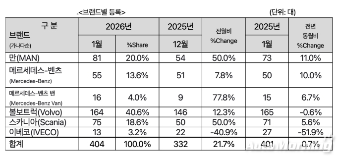 [오토모닝 정영창 기자] 한국수입자동차협회(KAIDA)는 2026년 1월 수입 상용차 신규등록대수가 404대로 집계됐다고 9일 밝혔다. 전년 동월 대비 0.7% 증가한 수치다.