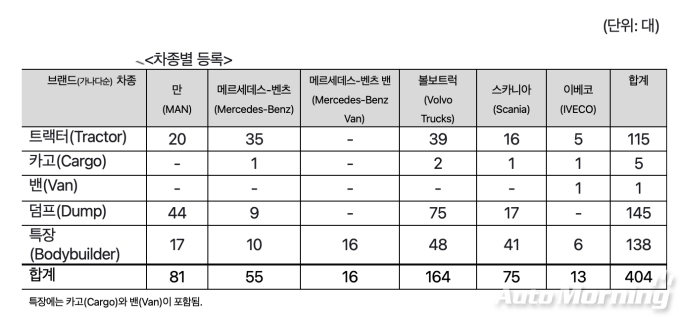 지난달 브랜드별 등록대수는 볼보트럭이 164대로 가장 많았다. 이어 만(MAN) 81대, 스카니아 75대, 메르세데스-벤츠 55대, 메르세데스-벤츠 밴 16대, 이베코 13대 등을 기록했다.