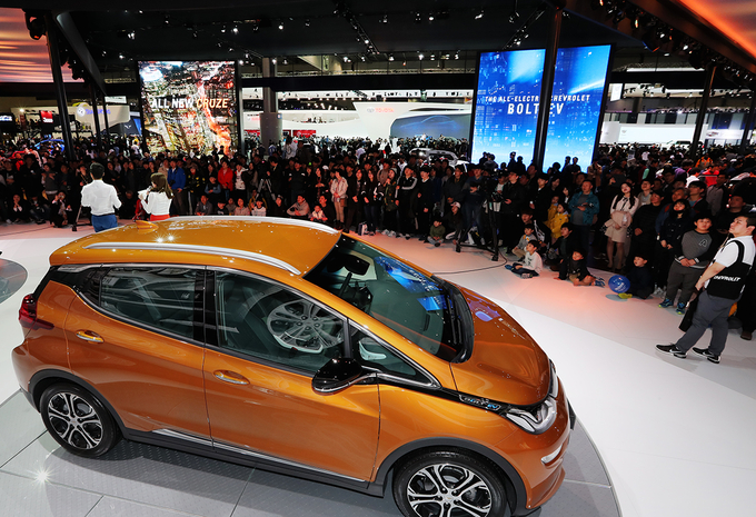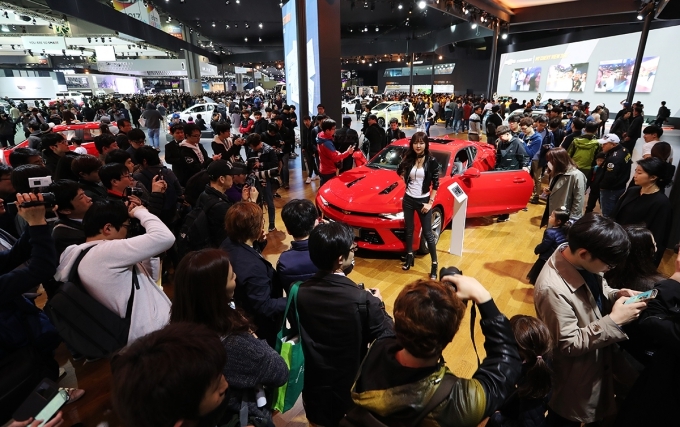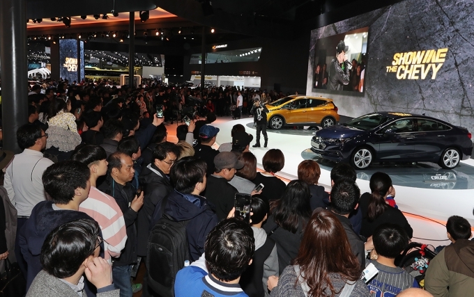 [오토모닝 정영창 기자] 경기도 일산 킨텍스에서 열리고 있는 '2017 서울모터쇼' 개막 후 첫 주말인 1~2일 쉐보레 전시관을 찾은 방문객들이 볼트 EV, 신형 크루즈, 카마로 등을 관람하고 있다. 볼트 EV는 383km의 국내 최장 주행거리를 인증 받은 순수 전기차다.