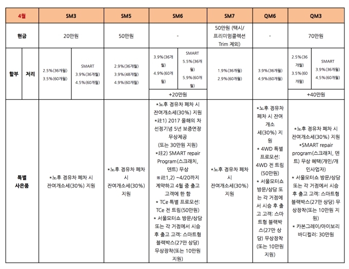 아울러 QM6는 노후 경유차 개별소비세 지원과 함께 할부 구매 시 3.9%(36개월), 4.9%(60개월)의 저리혜택을 제공한다. SM3는 현금 구입 시 20만원 할인혜택을 드리며 할부는 2.5%(36개월), 3.5%(60개월)의 저금리와 3.9%(36개월), 4.5%(60개월)의 스마트 잔가보장 할부 중 선택 가능하다.