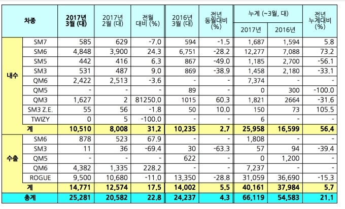 1~2월 공급부족을 겪었던 QM3는 지난달 1627대가 판매됐다. SM5와 SM3는 전년동월 대비로는 각각 49.0%, 38.9% 감소했지만, 전월 대비로는 각각 6.3%, 9.0% 늘었다. 다만 QM6는 2422대가 판매돼 전달보다 3.6% 판매량이 줄었다.
