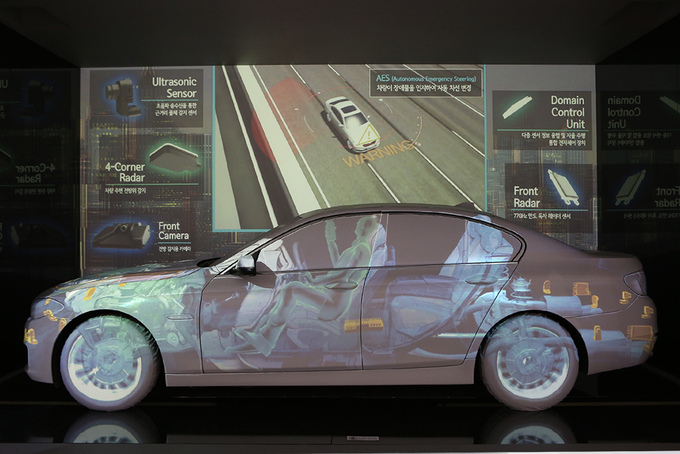 현대모비스는 전시주제를 ‘감춰진 기술의 힘’으로 정하고 미래 자동차에 적용되는 각종 전장기술, 부품 등을 전시한다. 레이더, 카메라 등 자율주행차의 구성 부품을 한 눈에 볼 수 있는 ‘첨단운전자지원시스템 모듈카', 바퀴 내에 구동모터가 장착된 인-휠시스템이 눈길을 끈다.