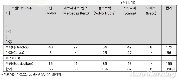 차종별 판매 비중은 트랙터가 179대로 총 판매량의 절반에 육박했고 특장 155대, 카고 56대가 각각 판매됐다. 트랙터와 특장은 볼보트럭이 각각 54대, 86대를 판매해 1위에 올랐고 카고는 스카니아가 27대로 1위에 올랐다.