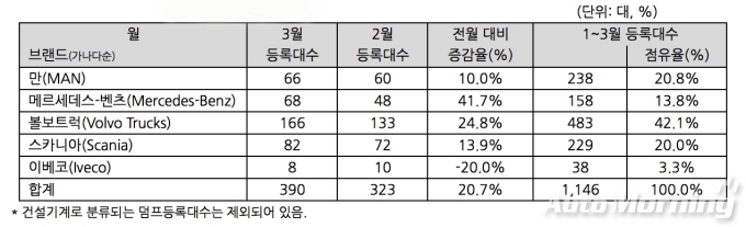 지난달 상용차 브랜드별 등록대수는 볼보트럭이 166대로 집계가 시작된 올 1월부터 3개월 연속 선두 자리를 지켰다. 전월보다 24.8% 늘었다. 이어 스카니아 82대(13.9%↑), 메르세데스-벤츠 68대(41.7%↑), 만 66대(10.0%↑), 이베코 8대(20.0%↓) 등의 순이었다.