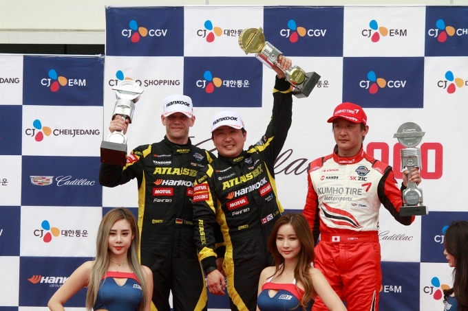 [오토모닝 정영창 기자] 한국타이어는 자사가 후원하는 아트라스BX 레이싱팀의 조항우 선수와 팀 베르그마이스터 선수가 지난 16일 용인 스피드웨이에서 열린 2017 CJ대한통운 슈퍼레이스 챔피언십 캐딜락 6000 클래스 개막전에서 1, 2위에 오르는 원투피니쉬를 기록하며 우승을 차지했다고 17일 밝혔다.