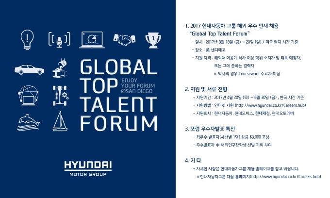 현대차그룹은 오는 8월18일부터 20일까지 3일에 걸쳐 미국 샌디에이고에서 '글로벌 톱 탤런트 포럼'을 개최하기로 했다고 20일 밝혔다. 이를 통해 해외에서 유학 또는 근무 중인 이공계 석·박사 학위 취득 및 예정자와 경력사원을 채용할 계획이다.