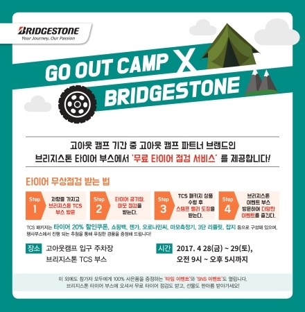 브리지스톤 타이어는 고아웃 캠프 페스티벌 현장에 홍보부스와 함께 타이어를 점검할 수 있는 TCS부스를 마련한다. TCS부스에서는 페스티벌 참가자 차량의 타이어를 무상으로 점검해준다.
