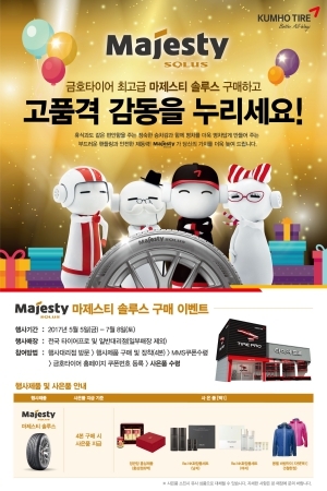 [오토모닝 정영창 기자] 금호타이어는 프리미엄 고성능 타이어 ‘마제스티 솔루스’ 구매 고객을 대상으로 오는 5일부터 7월8일까지 사은품 증정 행사를 시행한다고 2일 밝혔다.