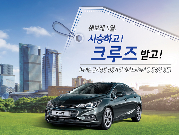 쉐보레 홈페이지를 통해 신형 크루즈 시승을 신청하거나 상담에 참여한 고객을 대상으로 추첨을 통해 신형 크루즈 3대를 경품으로 제공하며, 다이슨 퓨어쿨 공기청정 선풍기, 다이슨 슈퍼소닉 헤어 드라이어, 뱅앤올룹슨 스피커 등 유명 프리미엄 가전제품도 사은품으로 마련했다.