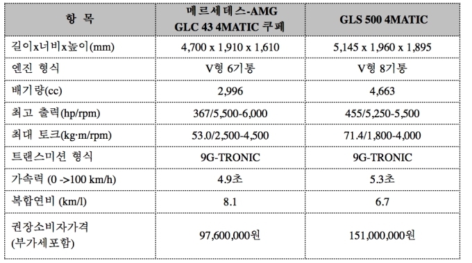 [오토모닝 정영창 기자] 메르세데스-벤츠 코리아가 미드사이즈 SUV 쿠페 더 뉴 GLC쿠페의 고성능 모델 더 뉴 메르세데스-AMG GLC 43 4매틱 쿠페와 'SUV의 S-클래스' 를 표방하는 최고급 플래그십 SUV 인 더 뉴 GLS의 최상위 모델 더 뉴 GLS 500 4매틱을 출시했다고 2일 밝혔다.