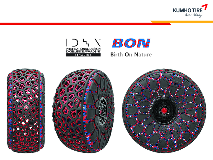 금호타이어가 수상한 제품은 미래 지향적 기술력을 담은 컨셉타이어인 ‘본’이다. 제품명에서 알 수 있듯이 ‘본(BON)’은 자연의 뼈 구조에서 모티브를 얻어 디자인한 비공기압 타이어이다. 벌집, 나뭇잎의 세포모양 등과 같은 자연의 비정형적 패턴 구조를 뜻하는 보로노이 구조를 적용해 구조적 안정성과 경제적 효율성을 확보했다.