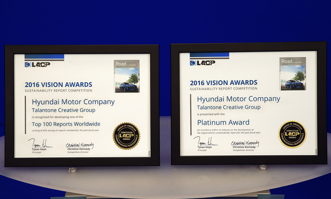 2016 LACP 비전 어워드 관계자는 “‘현대차 2016 지속가능성 보고서’는 당사의 지속가능경영에 대한 의지와 성과를 잘 담아내는 동시에 정보 접근성을 한층 높인 구성이 돋보였으며 글로벌 자동차기업 현대차만의 기업 아이덴티티를 창의적으로 구현한 디자인에 높은 점수를 줬다”고 밝혔다.