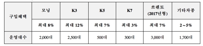 차종별로 구체적으로 살펴보면, 대한민국 대표 경차 모닝의 경우 최대 8%의 할인율을 적용받아 76만원에서 최대 123만원까지 혜택을, K3는 최대12%의 할인을 통해 167만원에서 최대 252만원까지 혜택을 받을 수 있다. 또한 K5는 7%의 할인을 적용 받으면 158만원에서 최대 204만원까지 할인된 가격에 차량을 구입할 수 있다.