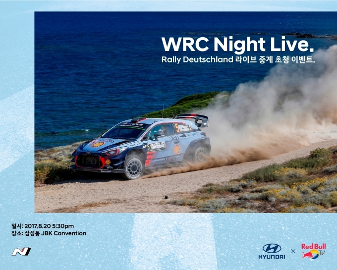 ‘WRC 나이트 라이브’는 오는 8월 20일(일) 오후 5시30분부터 9시30분까지 JBK컨벤션홀(서울 강남구 소재)에서 진행되며, 총 70여 명의 모터스포츠 팬들을 초청해 WRC 10차 대회 ‘독일 랠리’의 긴장감 넘치는 마지막 스테이지를 생중계할 예정이다.