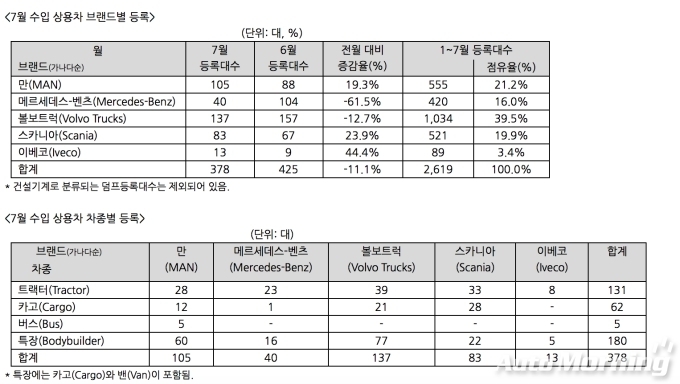 [오토모닝 정영창 기자] 한국수입자동차협회는 7월 신규 등록된 수입 상용차 대수가 총 378대로 집계됐다고 10일 밝혔다.