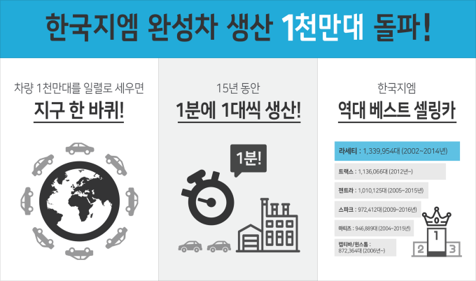 한국지엠이 7월까지 생산한 자동차 1000만 대를 일렬로 세우면 길이가 지구 둘레 한 바퀴(약 4만km)를 넘어서며, 시간으로 환산하면 약 1분에 한 대씩 생산된 결과이다.
