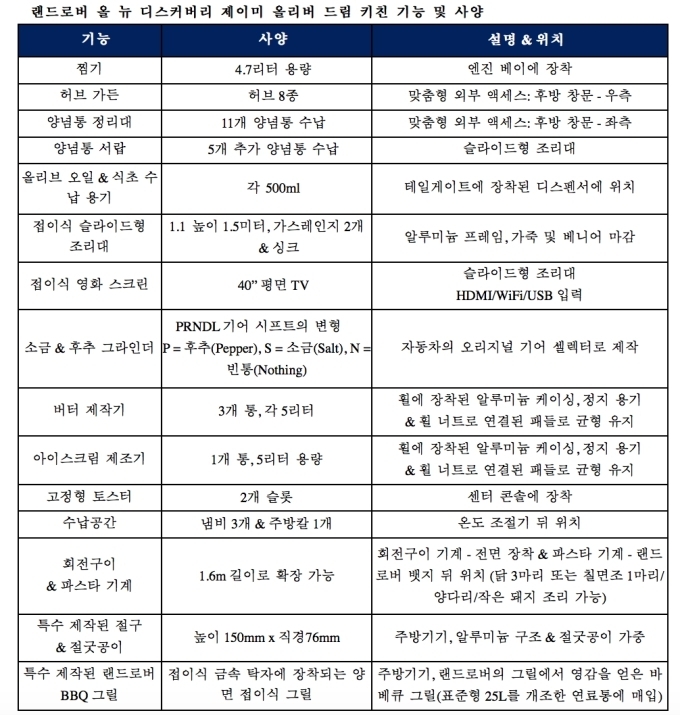 또한 “올 뉴 디스커버리는 고객들이 일상을 신나는 모험으로 만들 수 있도록 해준다. 그리고 특수 제작된 이 자동차는 제이미와 그 가족에게 어디에서나 맛있는 음식을 조리할 수 있도록 해줄 것이다. SVO가 안목 있는 고객들의 니즈를 진정으로 이해하기 위해 만든 비스포크 팀은 자동차를 각 고객의 라이프스타일에 맞게 맞춤 제작하고 있다”고 설명했다.