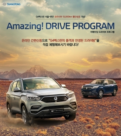 ‘G4 렉스턴 어메이징 드라이브’는 온라인을 통해 편리하게 신청할 수 있는 시승 프로그램으로, G4 렉스턴의 주행성능을 직접 체험해 보고 푸짐한 선물도 받을 수 있다.