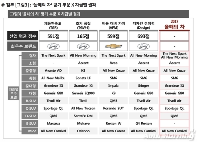 한편 컨슈머인사이트는 2001년부터 매년 7월 실시해 온 ‘연례 자동차 기획조사’는 1년 이내 새 차 구입자(6056명)의 핵심 평가 2개(제품만족도, 초기품질 문제점 수), 3년 이내 새 차 구입자(1만9143명)의 평가 1개(비용 대비 가치), 향후 2년내 구입 예정자(5529명)의 평가 1개(디자인 경쟁력)를 엮어 소비자 관점의 ‘올해의 차’를 선정했다.