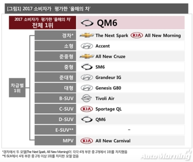 [오토모닝 정영창 기자] 컨슈머인사이트는 25일 소비자가 새 차를 구입하고, 사용하면서 느낀 경험을 토대로 한 ‘올해의 차’에 르노삼성 QM6가 선정됐다고 밝혔다.