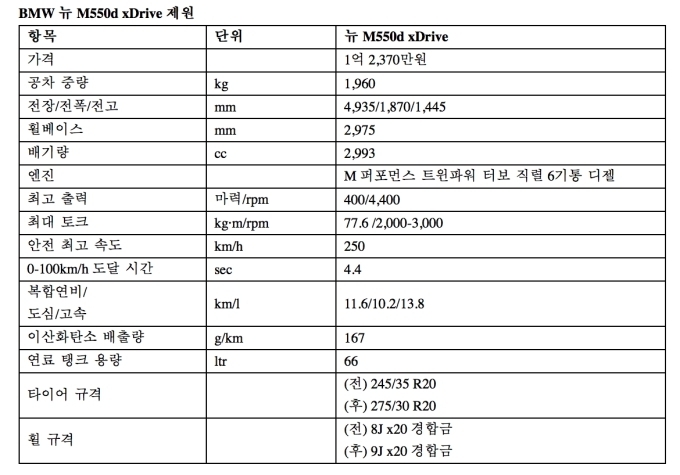 뉴 M550d xDrive는 5시리즈 세단 중 가장 강력한 성능을 갖춘 모델로, M 퍼포먼스 모델 특유의 차별화된 디자인과 성능, 새로워진 옵션을 통해 강력한 드라이빙을 제공한다. 동급에서 가장 강력한 성능을 자랑하는 M 퍼포먼스 트윈파워 터보 직렬 6기통 디젤 엔진을 탑재했다.