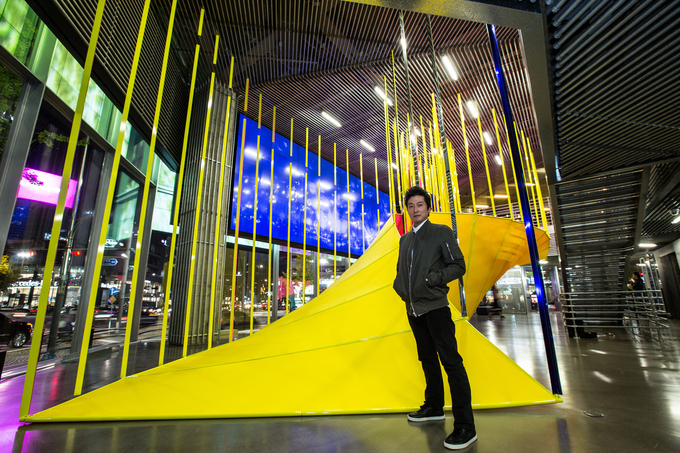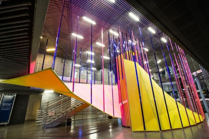 태풍의 눈 같은 구조가 ‘현대 모터스튜디오 서울’ 내부 1층, 2층 공간을 하나의 흐름으로 관통함으로써 웅장함을 연출한다. 특히 강렬한 노랑, 분홍, 파란색의 작품 색상이 관람객의 시선을 끌며 관람 위치에 따라 완전히 다른 색으로 변화하고, 이는 관람객들이 관점에 따라 하나의 현상을 다르게 볼 수 있다는 점을 시사한다.