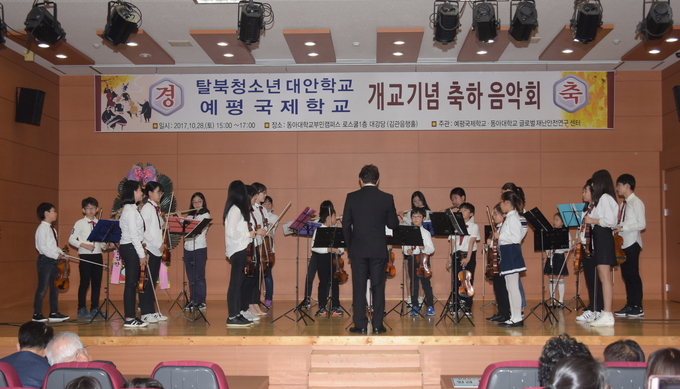 예평국제학교는 28일 토요일 오후3시에 동아대학교 부만 캠퍼스에서 개교 기념 음악회를 개최했다. 이번 음악회는 탈북 아이들과 다문화 가정에 대해 관심과 지원을 촉구하는 자리로 탈북민인 예평국제학교 교사와 재학생들의 탈북 이야기, 다문화 꿈나무 오케스트라 연주 등으로 꾸며졌다.