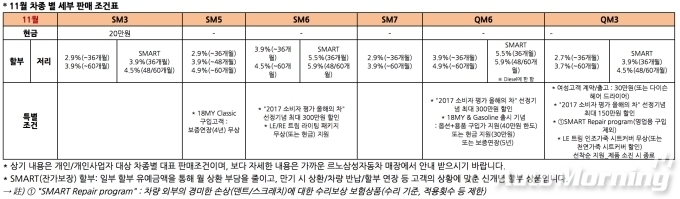 이와 함께 차종 별로 취향에 따라 선택 가능한 특별조건도 제공한다. QM6 2018년형 출시 기념으로 해당 차종 구매 시 40만원 상당의 용품/옵션, 30만원 현금 할인, 그리고 5년 보증연장 중 한 가지를 지원하며, SM6 LE/RE 트림 구매 시 LED 퓨어 비전 헤드램프와 3D 타입 LED 리어 콤비네이션 램프, 전방 안개등이 포함된 라이팅 패키지 또는 최대 60만원 현금 지원 중 선택할 수 있다.