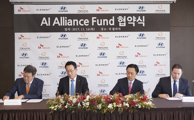 3사와 엘리먼트 AI는16일 오전 서울 플라자 호텔에서 지영조 현대자동차 전략기술본부장, 유영상 SK텔레콤 전략기획부문장, 김용현 한화자산운용 대표이사 및 엘리먼트 AI CEO 장 프랑스와 가녜가 참석한 가운데, ‘AI 얼라이언스 펀드’ 설립을 위한 협약식이 열렸다.