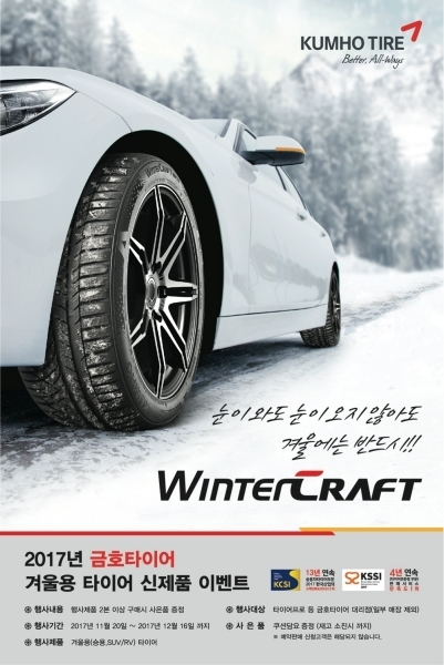 [오토모닝 정영창 기자] 금호타이어는 20일부터 다음달 16일까지 전국 금호타이어 대리점(일부매장 제외)에서 겨울용 타이어 구매고객을 대상으로 사은품을 증정하는 이벤트를 실시한다.