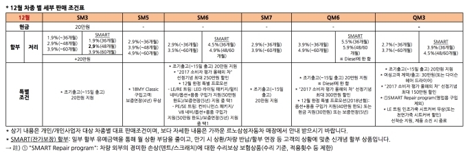 12월 중 전 차종(SM5, QM6 가솔린 제외) 구입 시 조기 출고 고객에 한해 20만원의 특별 할인혜택을 제공한다. 본 혜택은 오는 15일까지 출고된 차량에 적용된다. 아울러 '2017 소비자 평가 올해의 차' 선정 기념 QM6, SM6, QM3 3개 차종 대상 특별 판매조건이 12월에도 이어진다. QM6와 SM6 구매 시 각각 최대 300만원과 250만원, QM3 구매 시 최대 150만원의 할인 혜택을 제공한다.