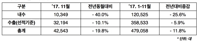 이는 전년 동월대비 내수는 40.0%, 수출은 10.1% 감소했고, 전체적으로는 19.8% 줄었다.
