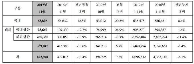 이는 전년 동월대비 국내 판매는 12.8% 증가했으나, 해외 판매가 13.6% 줄면서 전체적으로 10.4% 감소했다.